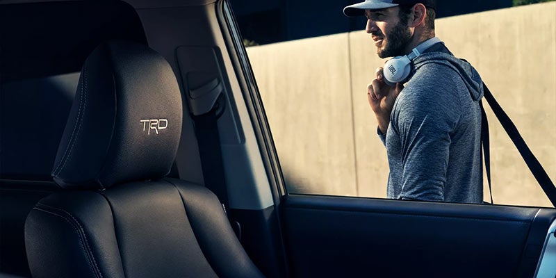 Take a seat inside TRD Sport and the SofTex®-trimmed seats with gray contrast stitching fit you like a glove. Distinguishing details like its gray TRD lettering stitched on the front headrests and shift knob hint that this rig is ready to go all in.